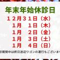 ホーム 病院からのお知らせ一覧 お知らせ 病院からのお知らせ 年末年始休診日のお知らせ2025.12.15 年末年始の休診日は、下記の通りとなります。12月31日(水) 1月 1日(木) 1月 2日(金) 1月 3日(土) 1月 4日(日)※休診期間中(12/31~1/4)は終日送迎ワゴンの運行もございません。<急患の方>「時間外受付」にて受付いたします。事前にお電話にて連絡の上、お越し下さい。新百合ヶ丘総合病院電話番号:044-322-9991<年末年始の面会について>面会については下記をご覧ください。・面会について※感染状況によっては面会禁止になる場合がございます。 [ 前のページへ戻る ]